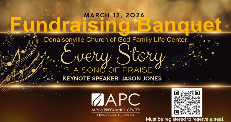 The second annual Alpha Pregnancy Center Banquet will be held at Donalsonville Church of God on Thursday, March 12 at 7 pm. Attendees must register for the event through the QR code, church registration sign-up sheet, or by contacting Candace Cofty (229)-726-9353.